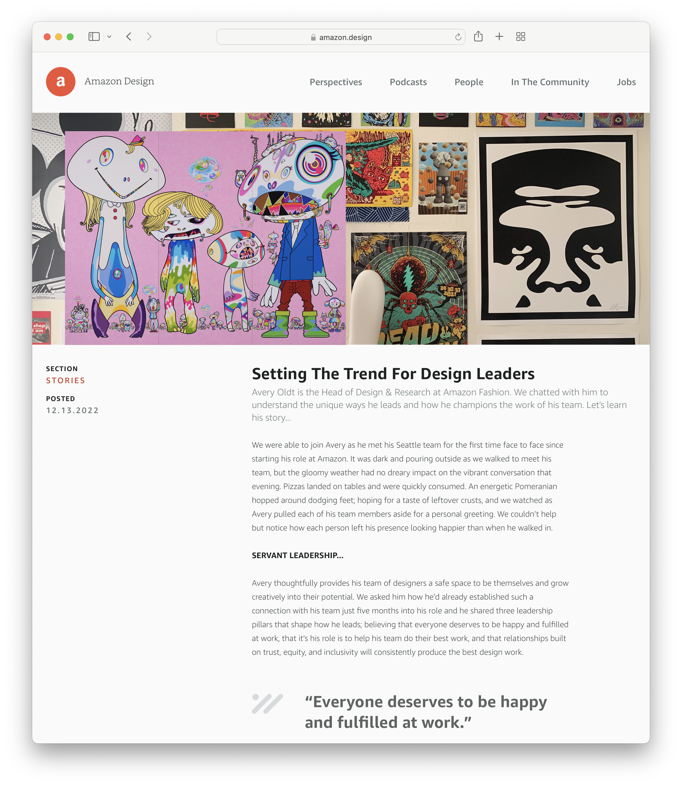 I've been here just a short time, but I'm already feeling valued as a design leader and proud to be a part of this team. I was thrilled to be featured by Amazon.design recently in the story below, Setting the Trend For Design Leaders.