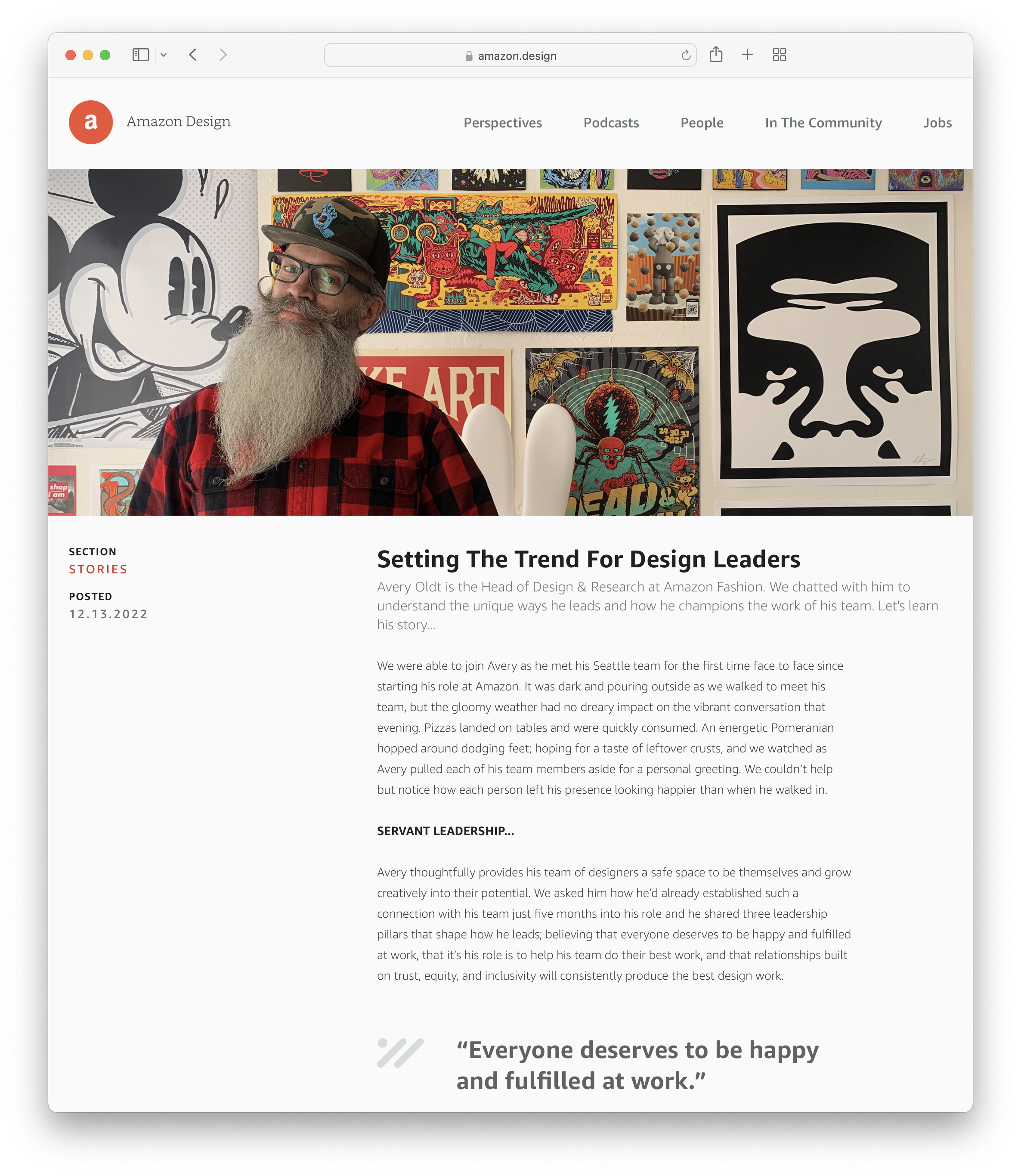 I've been here just a short time, but I'm already feeling valued as a design leader and proud to be a part of this team. I was thrilled to be featured by Amazon.design recently in the story below, Setting the Trend For Design Leaders.